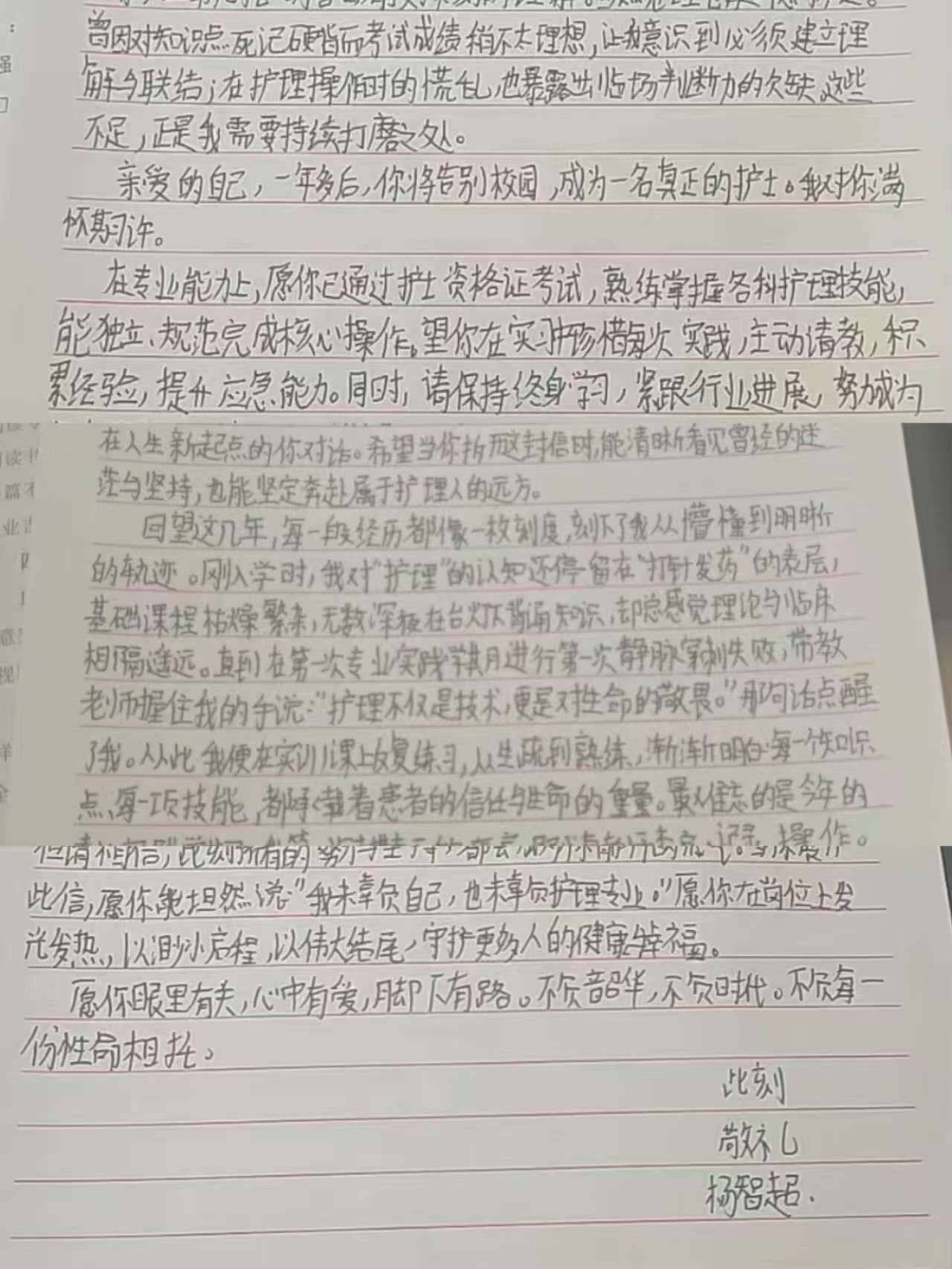 活动中,小组成员们纷纷执笔抒怀。周晶晶结合护理专业特色,写下深耕临床护理、守护患者健康的职业理想;刘轩诚回顾了在校期间的成长点滴,勉励未来的自己保持初心、勇毅前行;陈扬将对护理事业的热爱融入笔端,立志成为有温度、有担当的白衣天使;杨智超则规划了未来的学业与实践路径,决心以扎实的专业能力践行南丁格尔精神。