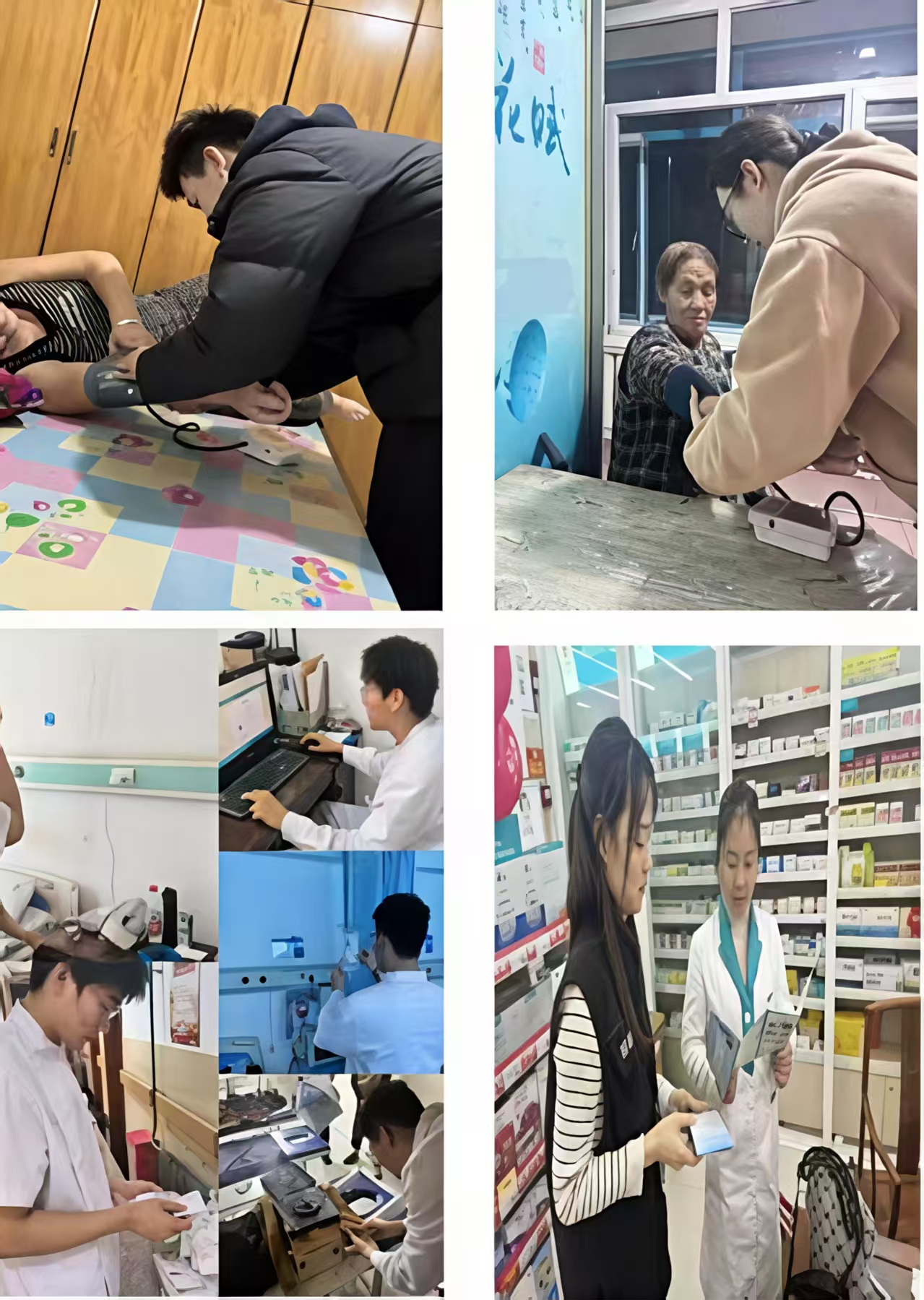 张昊同学在社区开展志愿服务,重点为辖区老年人提供贴心健康服务。他耐心为老人细致测血压,认真记录数据,仔细询问身体状况与用药情况,针对慢性病患者,逐一宣教药物服用方法、剂量及注意事项,叮嘱按时服药、定期监测, 用专业与耐心守护老年群体健康,让老人在家门口享受便捷健康指导,收获一致好 评 。