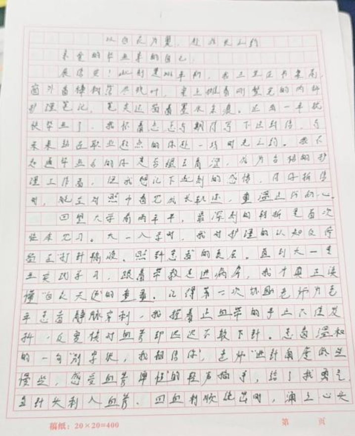 彭浩峰在信中聚焦护理行业发展趋势,写下了深耕专业领域、投身基层医疗服务的职业目标:“五年后的你,应该已经是一名正式的护士了。希望那时的你无论身处三甲医院还是社区诊所,都能记得今天的誓言——用专业抚慰伤痛,用温暖守护生命。”