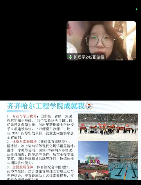 近日,我组同学通过腾讯会议回访高中母校,开展“感恩母校、宣讲大学”主题交流活动,为学弟学妹分享成长经历、介绍齐齐哈尔工程学院办学特色与育人成果,传递青春力量。宣讲中,我们以亲身经历讲述在齐工程的学习生活。学校始建于1991年,2011年升格为本科院校,是黑龙江省知名民办应用型本科高校,以工科为主,多学科协调发展,开设机械、电气、计算机、护理、经管等多个热门专业,注重实践教学与校企协同育人,毕业生就业率稳居前列。