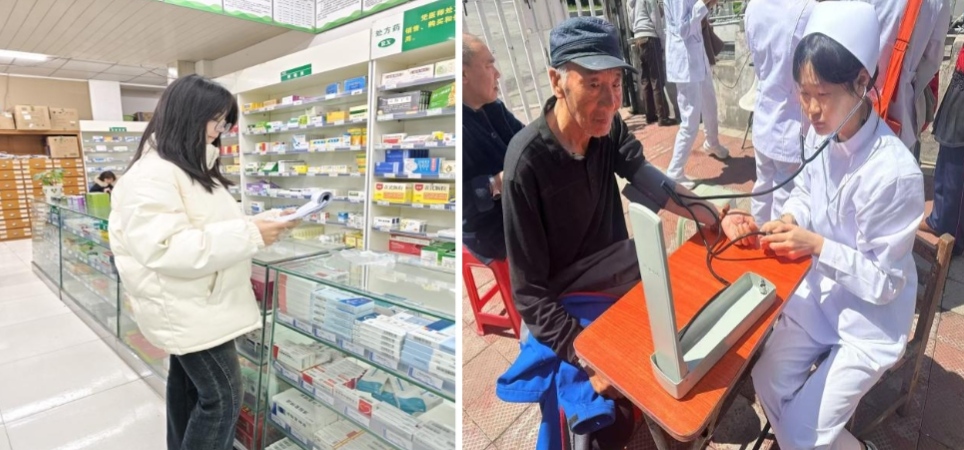李璐君同学在药店开展老年人高血压风险筛查志愿服务。她独自为前来咨询的老年朋友提供免费血压测量服务,细致讲解高血压日常防控要点、作息建议。她的专业守护,有效提升了老年朋友的高血压防治意识与自我健康管理能力,用暖心服务赢得认可。