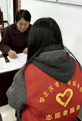 活动现场,刘芊慧身穿红色志愿马甲,与社区居民面对面交流,重点为老年群体提供贴心帮扶。针对部分老人视力不佳、对表格填写流程不熟悉等问题,她耐心讲解相关政策,手把手协助老人完成信息登记与资料填写,全程细致周到、耐心十足。