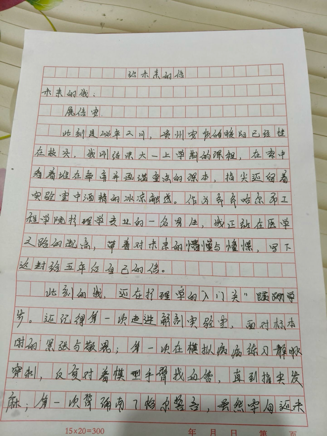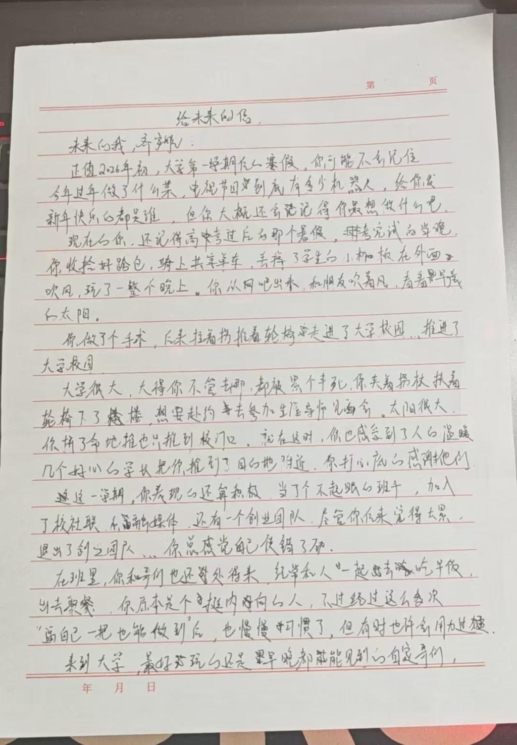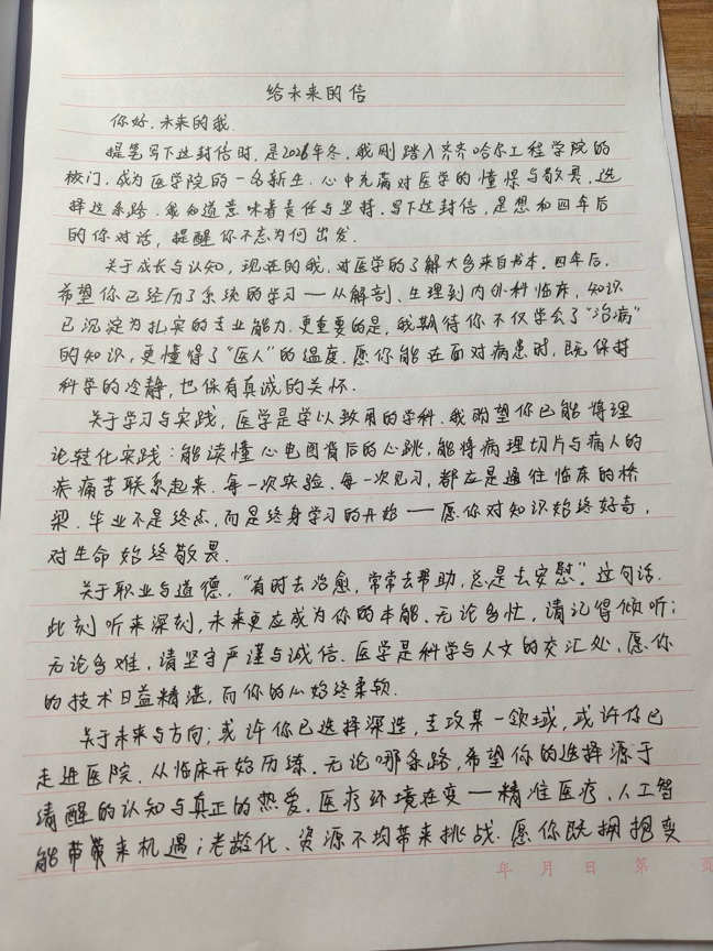 覃鑫鑫的信中回顾了初入学的紧张与坚定,直面外界对男护士的偏见,通过前辈事迹坚定了职业信念。他寄语五年后的自己:无论身在急诊、ICU还是手术室,都要保持初心、精进技术、传递温暖,做一名有温度的守护者。林思嘉作为医学院新生,寄语四年后的自己:希望历经系统学习后,既能掌握扎实医术,更懂“医人”温度;无论选择深造还是临床,都要坚守人文关怀与职业信念。叮嘱自己照顾好身体,保持同理心,持续学习,永葆初心。齐宇航这封写给未来的信回顾了高考后的自由夜晚、手术后的艰难入学,以及大学里同学的温暖帮助。作者从内向逐渐变得勇敢,参与社团和创业,虽感不适但也收获了成长与友谊。