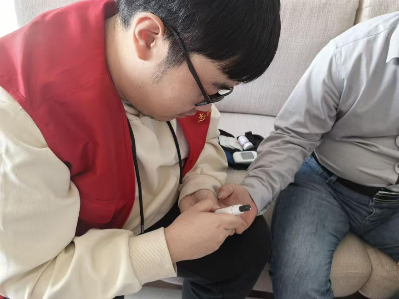 张维轩同学为老人们提供了血压测量与血糖检测双重健康服务,操作规范、细致认真,及时告知老人检测结果,并结合数据给予个性化健康指导,让老人们在家门口就能享受到便捷、专业的健康护理服务。