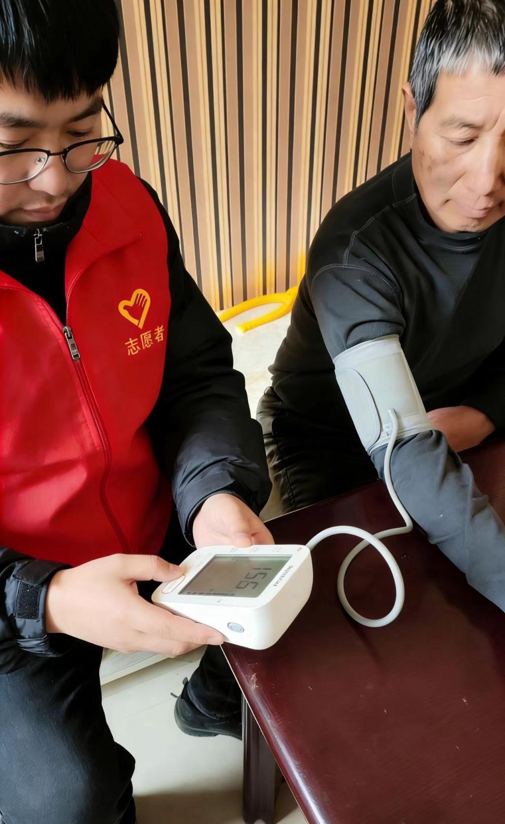 在养老服务驿站,程童岩同学熟练操作血压计,细致地为老人测量血压,耐心询问日常身体状况,用专业知识解读数据,提醒老人注意饮食与作息。