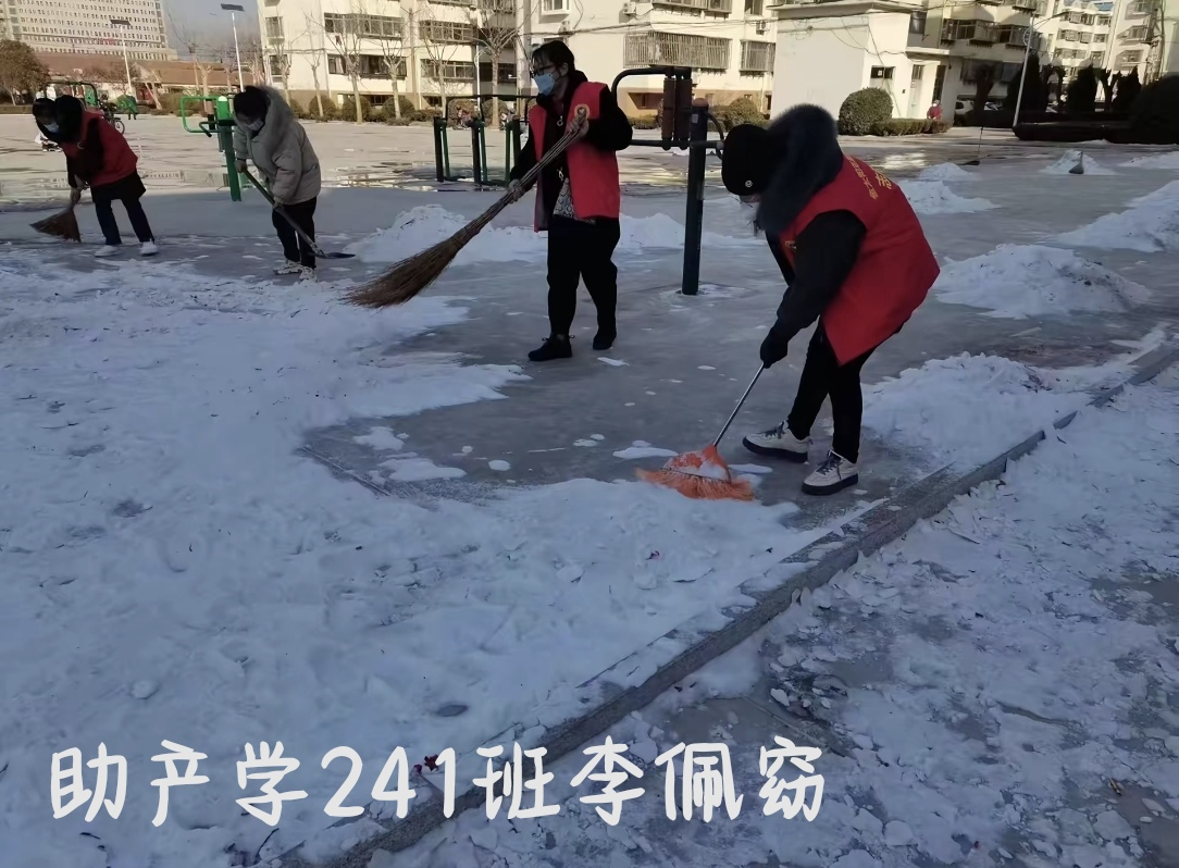 李佩窈:参与校园扫雪志愿服务,我收获良多,深受教育。为保障师生出行安全,我们齐心协力清理校园道路与楼宇周边积雪,以实际行动维护校园秩序。此次活动不仅锤炼了意志、增强了集体凝聚力,更让我深刻体会到“奉献、友爱、互助、进步”的志愿精神。劳动中,我践行了爱校荣校理念,强化了责任与担当意识。今后我将继续积极参与志愿服务,以青春之力服务校园、传递温暖。