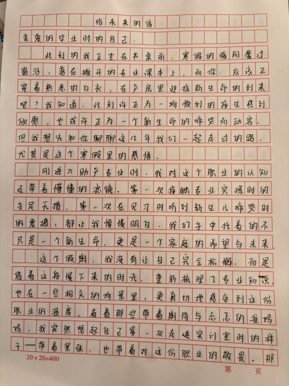 李金宇:写这封给十年后的信,让我对助产职业的理解更深刻,也明晰了未来的职业方向。身为大三助产专业学生,既有对职业的憧憬,也有对未知的忐忑,而这份十年规划,让迷茫有了答案。从夯实临床基础到深耕特色领域,再到成为复合型人才,每一步都凝聚着对这份职业的热爱与敬畏。我也懂得,助产不仅是专业技能的考验,更需要温柔的共情与对生命的坚守。这封信是期许,更是承诺,往后我会以初心为帆,以专业为桨,在守护新生的道路上稳步前行,不负时光,不负职业的神圣。
