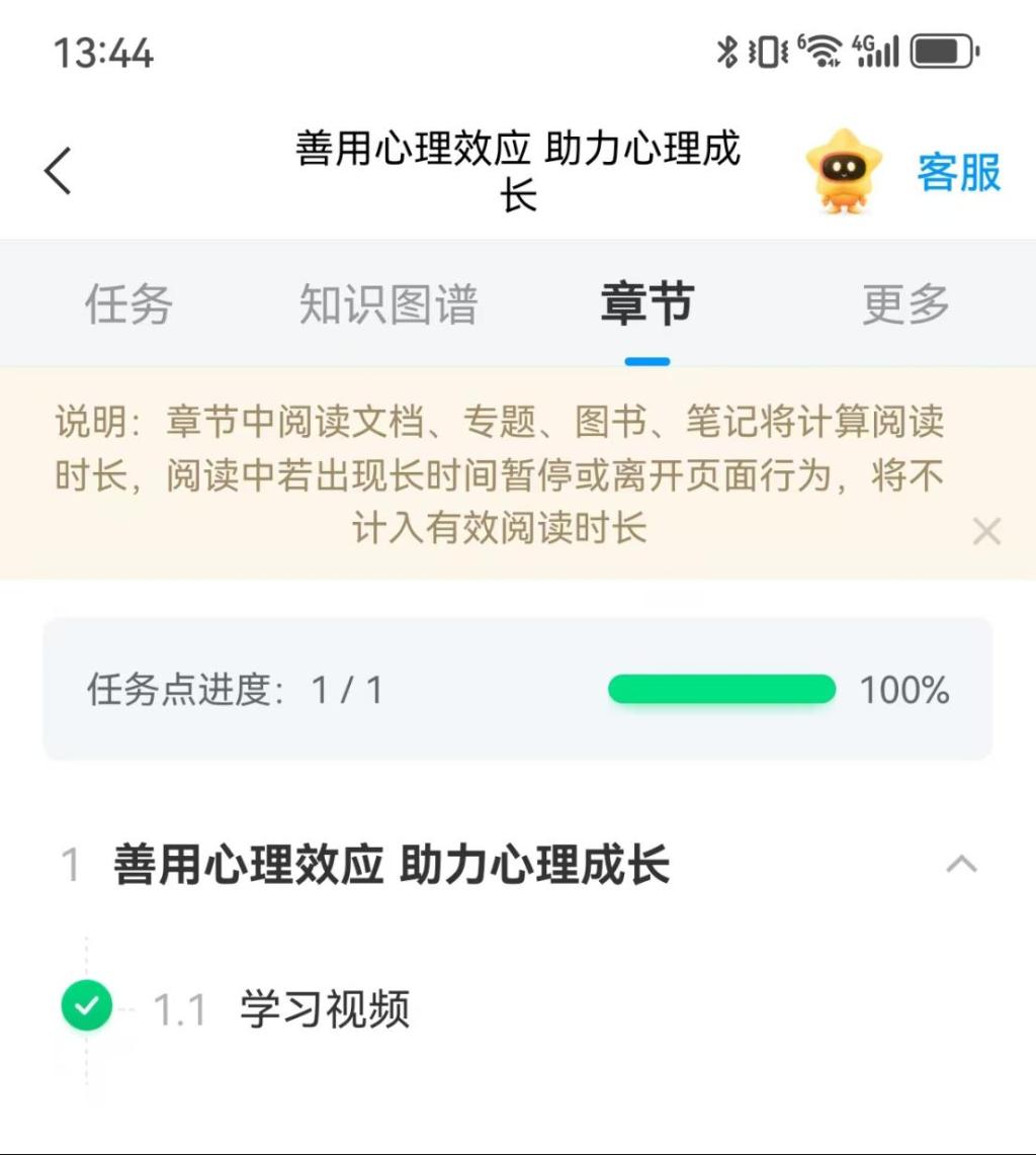 课程学习方面,四位成员同步推进核心必修课程,均100%完成任务点。社会实践学期安全教育课程中,大家系统学习安全防护知识与应急处理流程,熟练掌握实践安全规范;心理健康教育课程围绕“善用心理效应助力心理成长”展开,成员们学会科学调节情绪、缓解压力,筑牢心理防线,为后续实践做好充分准备。