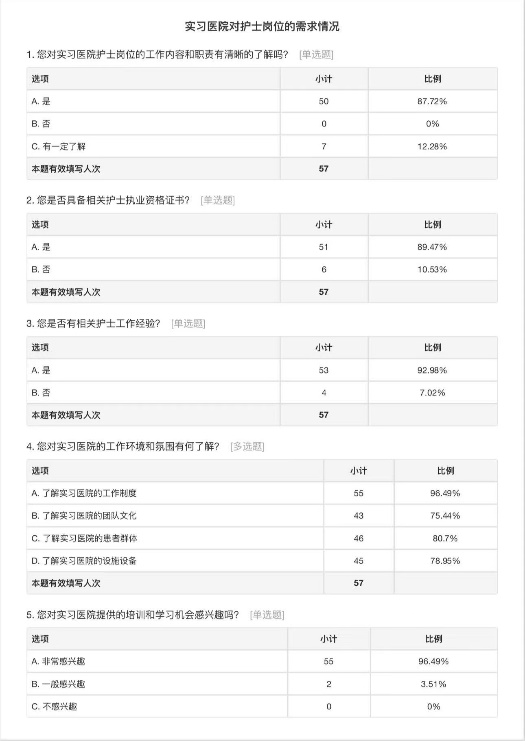 近日,护理学234班李雨霏团队在黑龙江省大庆市龙南医院开展的护士岗位人才需求调研完成,57份有效样本揭示了当前实习医院护士岗位的核心需求与发展趋势。