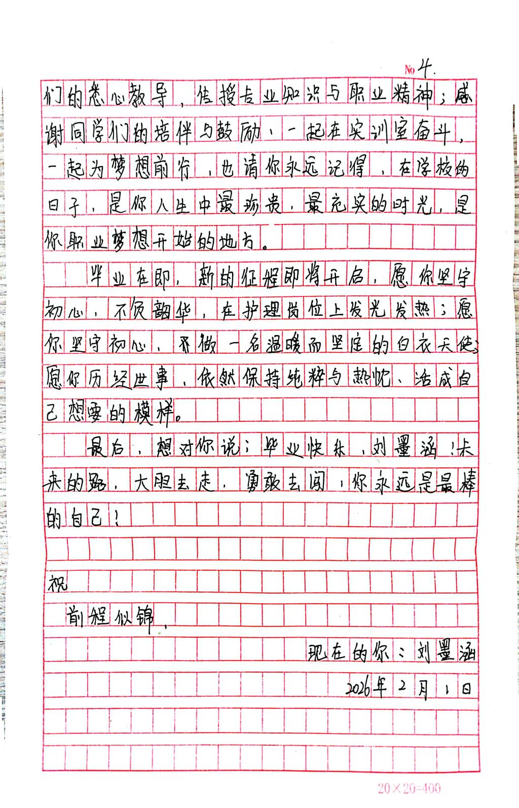 未来,刘墨涵将带着这封写给自己的信,在社会实践与临床实践中稳步前行,以专业坚守回应时代需求,在护理岗位上书写属于青年学子的成长答卷。