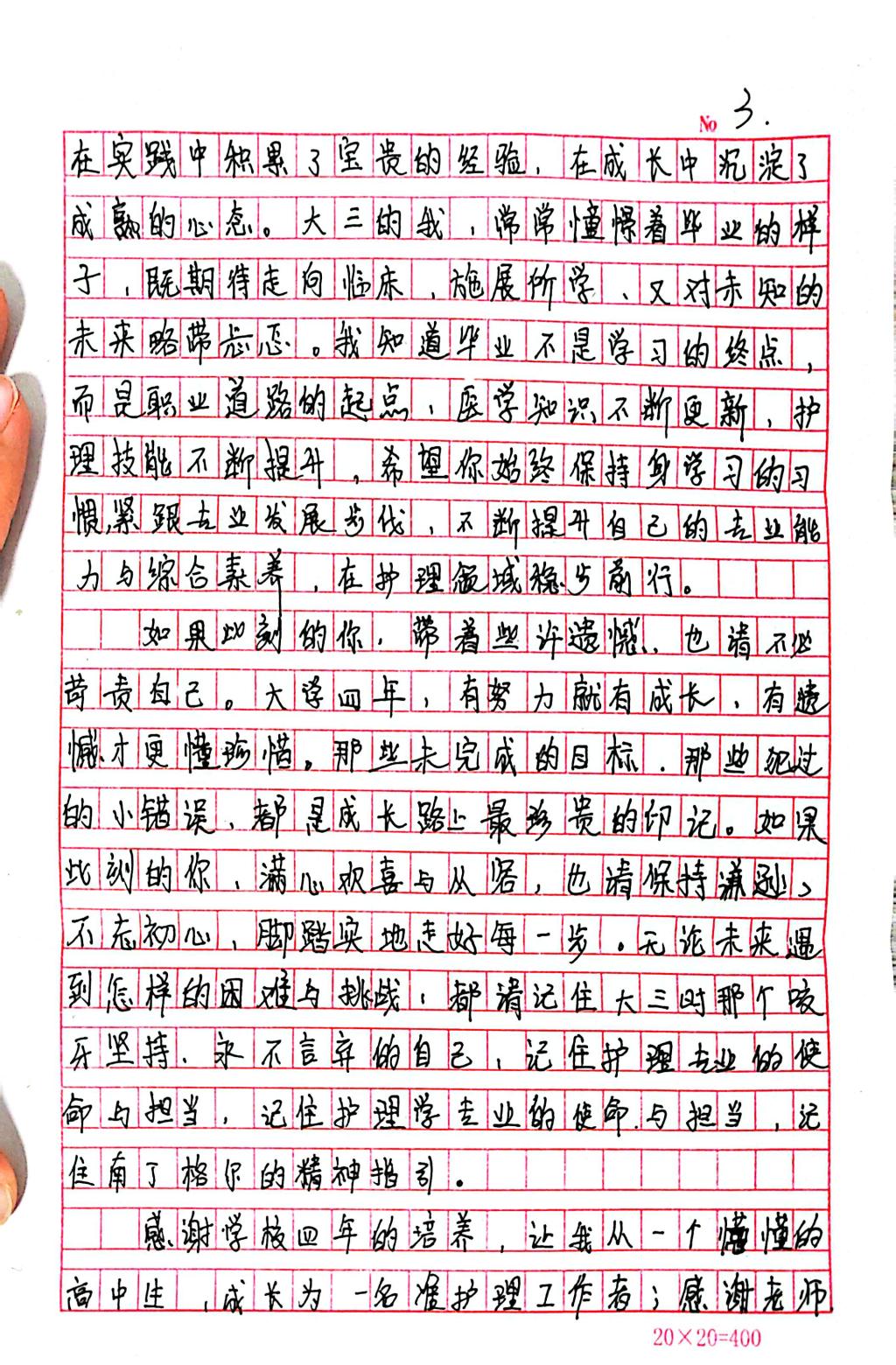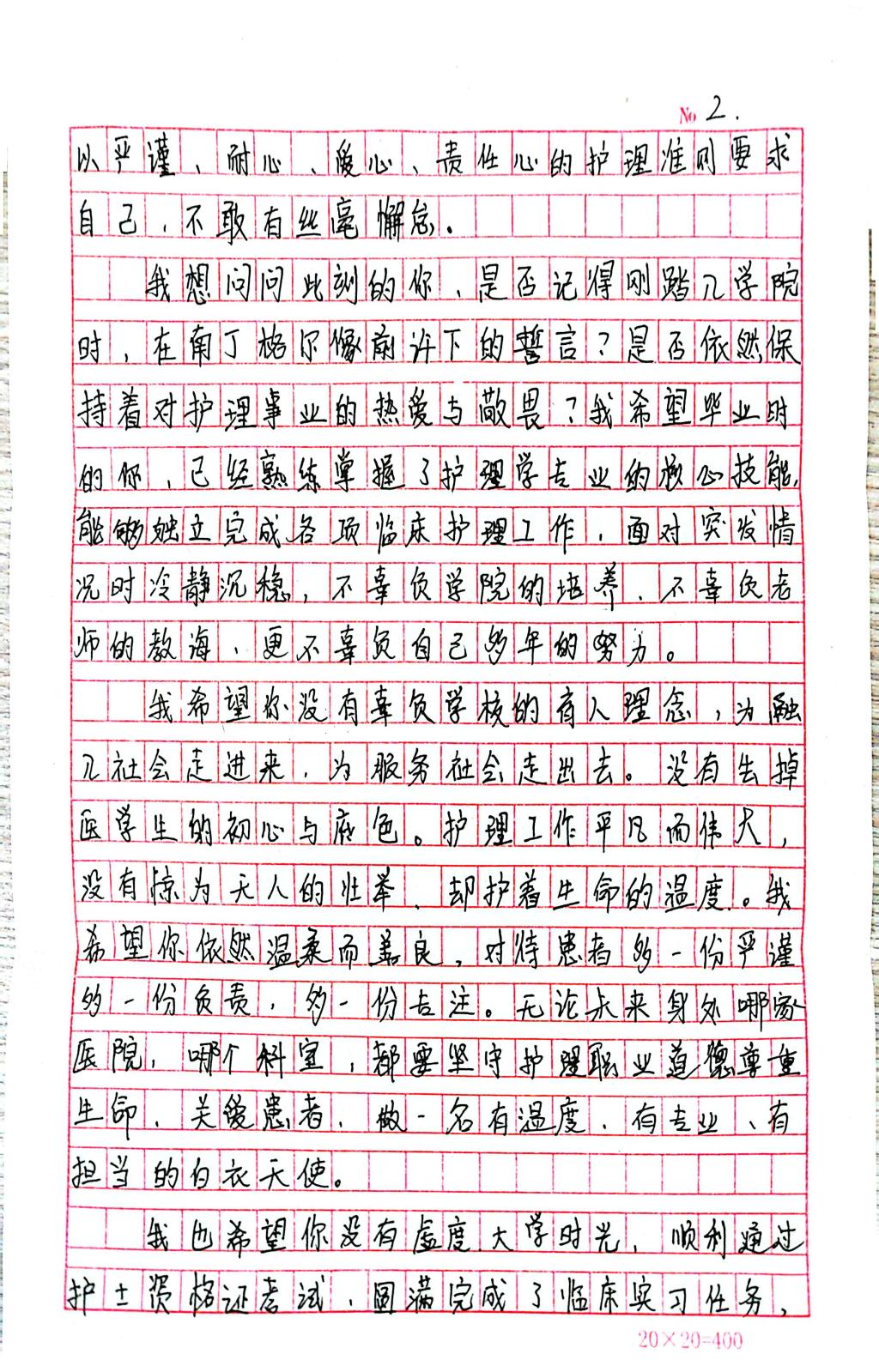 立足护理学专业核心素养,刘墨涵以“给未来的信”为载体,系统梳理了从专业选择到临床认知的成长脉络:她在信中回望初入护理学专业时的懵懂与憧憬,反思课堂知识与临床场景的衔接落差,也勾勒出未来成为一名兼具温度与专业度的护理人才的清晰画像。
