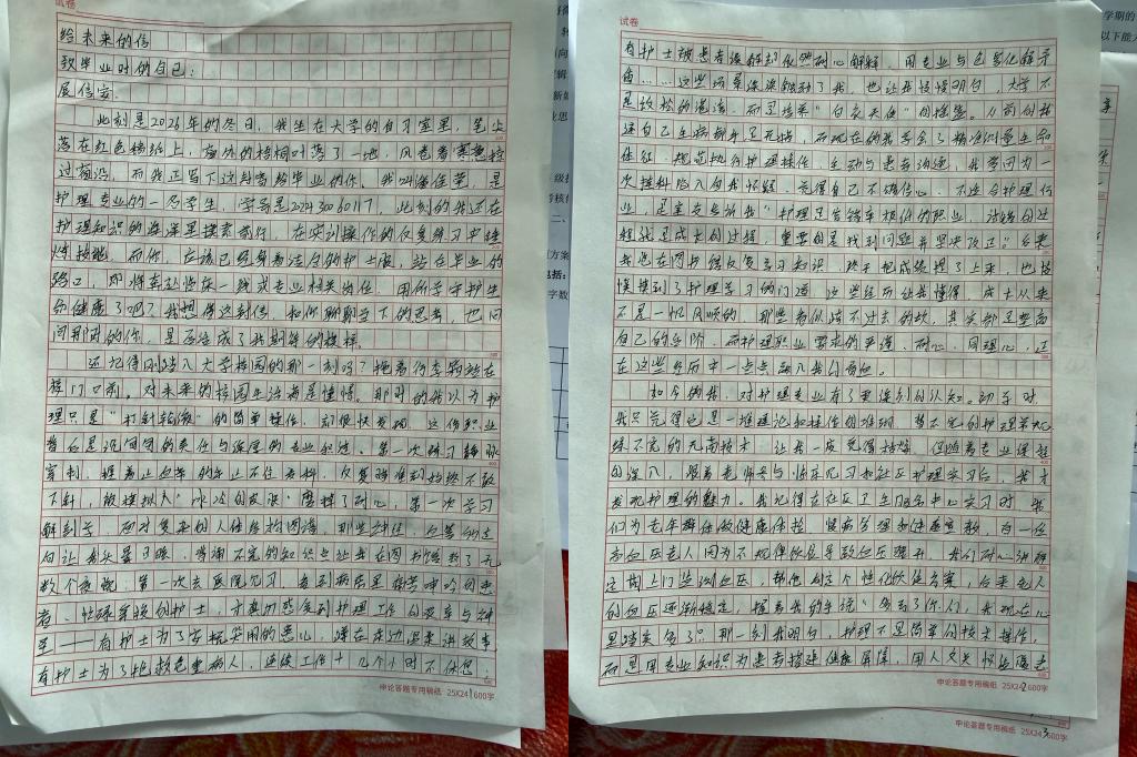 潘佳莹同学在信中回溯了从初入校园的懵懂,到临床见习、社区实践中对护理职业的深刻领悟,字里行间满是成长蜕变。信中,潘佳莹同学将个人理想与专业使命深度交融、展望未来。或立志投身三甲医院,成为一名临床护士,以精准操作守护患者安康;或计划扎根社区护理、老年护理领域,为基层群众与老年群体筑牢健康屏障;或期许考取公务员,为护理行业发展添砖加瓦。同时,潘佳莹同学也不忘叮嘱未来的自己,在忙碌的工作中学会调节身心,珍惜身边的亲友,坚守选择护理专业的赤诚初心,用专业与温度诠释南丁格尔精神。