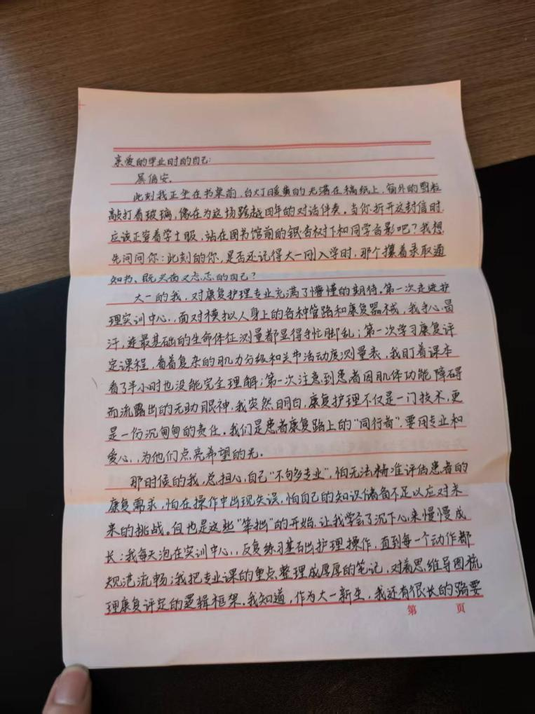 刘熙同学以一封书信致未来的自己,记录了康复治疗学专业学习的初心。他回顾实训中的忐忑与成长,立下用专业守护患者的誓言,尽显青年医学生的责任与担当。