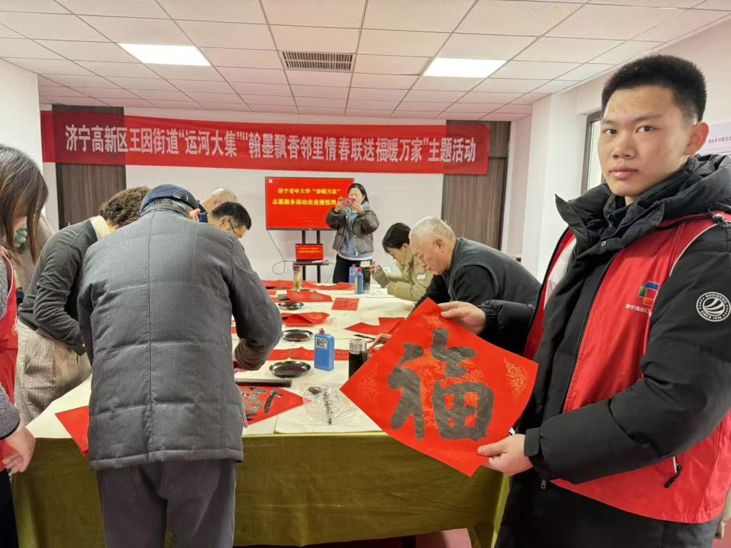 1月30日,李家辉在济宁高新区王因街道参与春联送福活动,优化场地防滑设置、协助行动不便老人就座,为关节活动受限者调整手持姿势,高效完成物料整理与分发工作,获现场广泛好评。