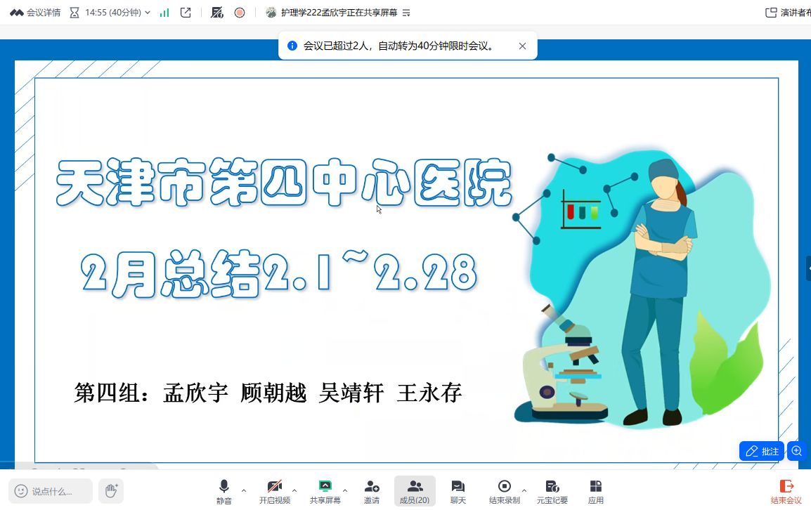 2026年2月25日晚,指导教师尹娜通过腾讯会议的方式召开天津市第四中心医院毕业实习2月份实习阶段总结会议,会议由孟欣宇同学主持,全体实习学生参加。