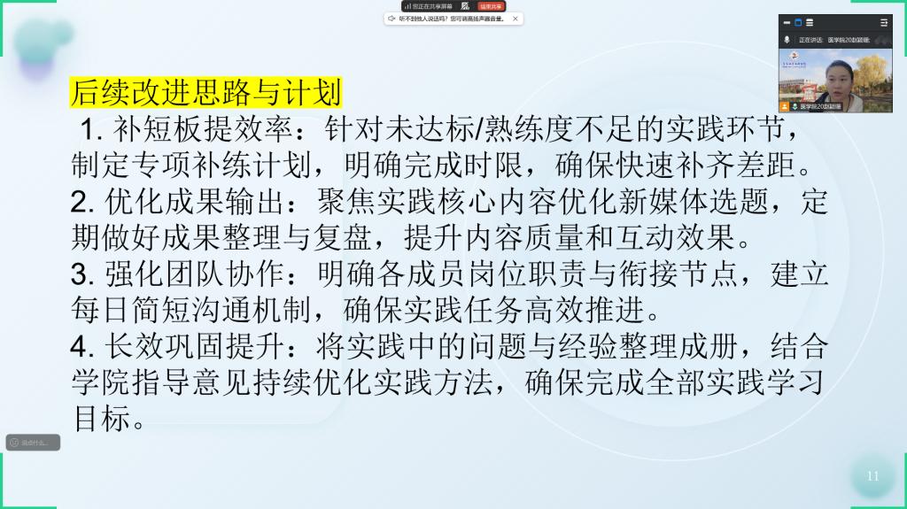 会议伊始,赵颖珊老师首先对学生们的社会实践表现给予充分肯定。她表示,从社区志愿服务一线到妇幼保健院的实践岗位,同学们始终以饱满的热情、严谨的态度投身实践,立足专业所长,将课堂所学转化为服务群众的实际行动,无论是物资传递、楼道清扫,还是药品整理、血压测量,每一项工作都彰显着新时代青年的责任与担当,每一次付出都见证着大家的成长与蜕变。