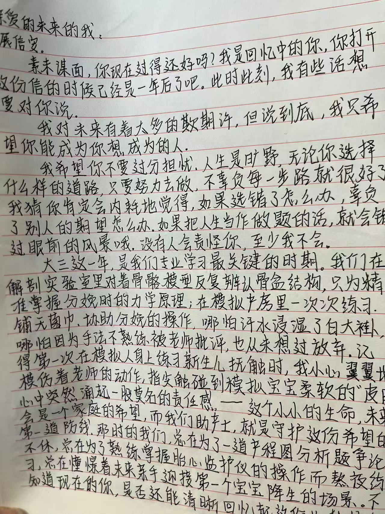 郭星池在致未来的信中,将“中而至庸,和而不同”的校训作为成长的指引,锚定了“守正立身,笃行致远”的未来方向。他表示,未来将以“中庸”为立身之本,在专业学习中坚守正道,脚踏实地提升专业素养,无论是理论钻研还是实践锻炼,都以精益求精的态度要求自己,做到知行合一、守正笃行;在个人发展中,践行“和而不同”的理念,在与同学、同事的协作中保持和谐共进的氛围,同时找准自身定位,发挥个人优势,在专业领域形成自己的特色与专长。他期许未来的自己,能将校训精神融入日常,以坚定的信念、务实的行动,在助产学领域脚踏实地、稳步前行,用专业能力守护生命,用初心担当诠释青春价值。