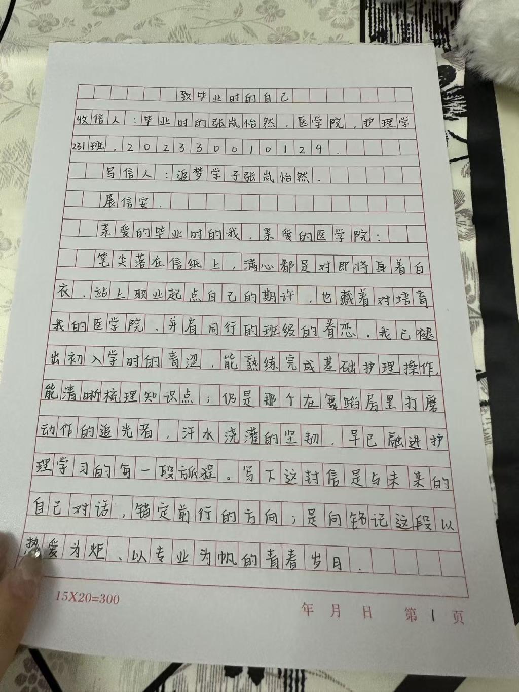 这封信是护理专业学生张岚怡然写给毕业时的自己。她回顾了三年大学生活:初入校园时对护理的认知模糊,在专业学习中逐渐理解“无菌”背后的生命敬畏,克服了解剖等课程的困难,熟练掌握了护理操作;舞蹈不仅是爱好,更锤炼了心性与团队协作能力她期待毕业时的自己褪去青涩,带着专业素养与仁心走上岗位,坚守初心、传递温度,不负青春与热爱。