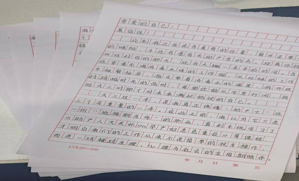 第三,暖阳洒落书桌,助产学专业书籍触手可及,陈梦娴同学的书信承载着她自己对专业的深度领悟,尽显“中而致庸”的专业追求。大三这一年,她跳出传统认知,系统学习《助产人文关怀》《孕产妇急危重症》等课程,打破“技术操作”的固有思维,领悟到助产是跨越生理、心理与社会的全周期陪伴。她在信中期许,未来身着工作服的自己,仍能坚守此刻的热忱,以专业初心守护孕产妇与新生的安康。
