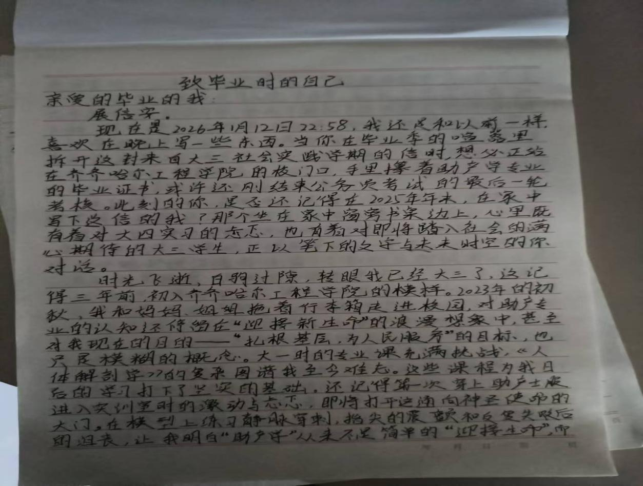 四封书信,四种心境,一段成长。这几名助产学子的笔墨,既是个人青春的印记,更是齐齐哈尔工程学院“中而致庸,和而不同”校训精神的生动实践。未来,相信更多齐工程学子将延续这份初心,在坚守正道中追求卓越,在兼容并蓄中彰显个性,书写属于新时代青年的担当与荣光。