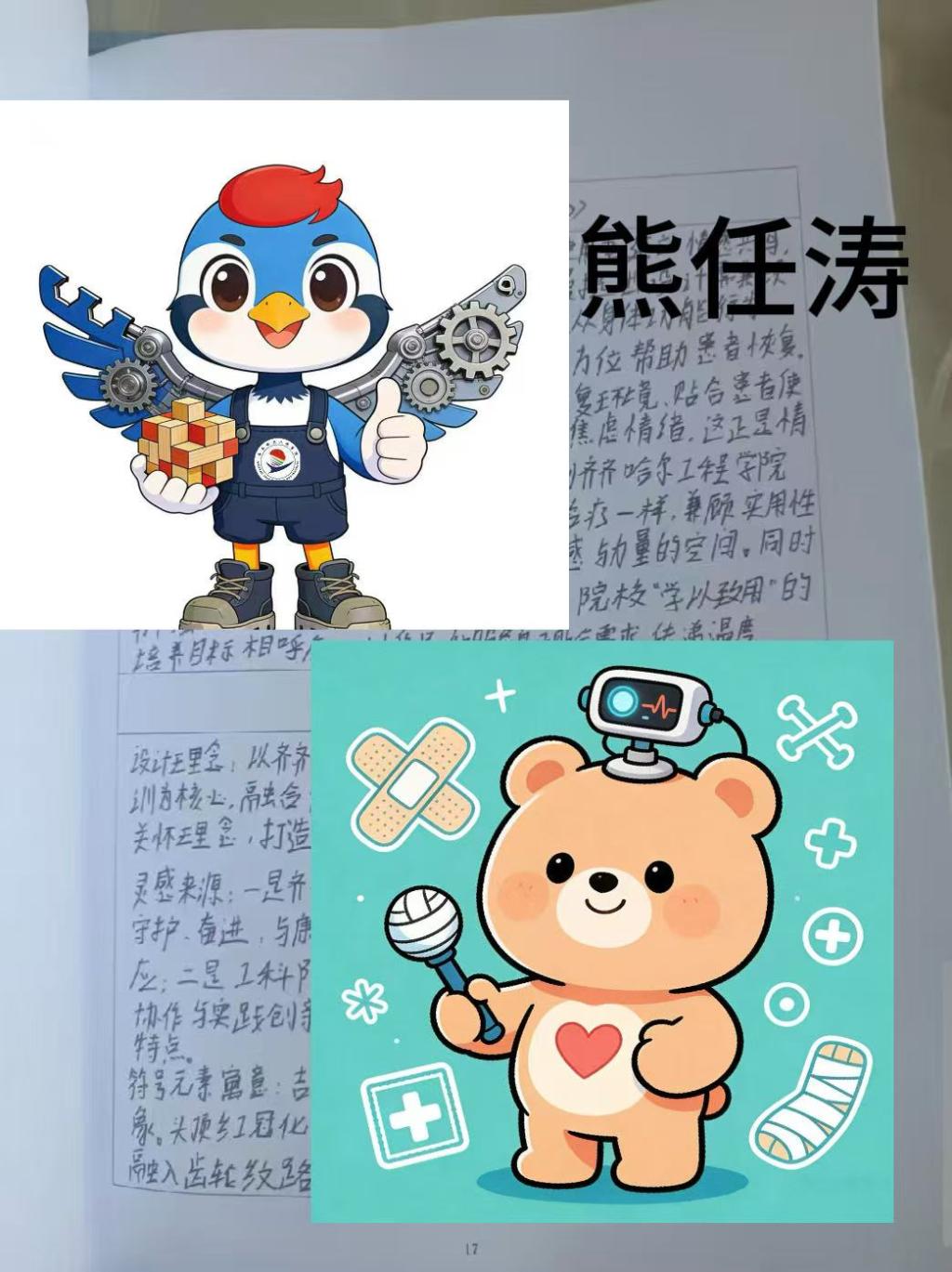 熊任涛同学结合人工智能设计的吉祥物“工小鹤”地域符号锚定:丹顶鹤是齐齐哈尔“鹤城”的核心标识,赋予吉祥物天然的地域归属感,传递学校扎根鹤城、服务地方的办学理念。工科属性凸显:齿轮羽翼、鲁班锁、工装裤等元素,精准契合“工程学院”的专业特色,象征学生兼具“鹤的高远志向”与“工科的务实本领”。“康小愈”代表着康复治疗师“守护健康、重塑功能”的职业使命,也象征着患者“重获新生、回归生活”的美好愿景。
