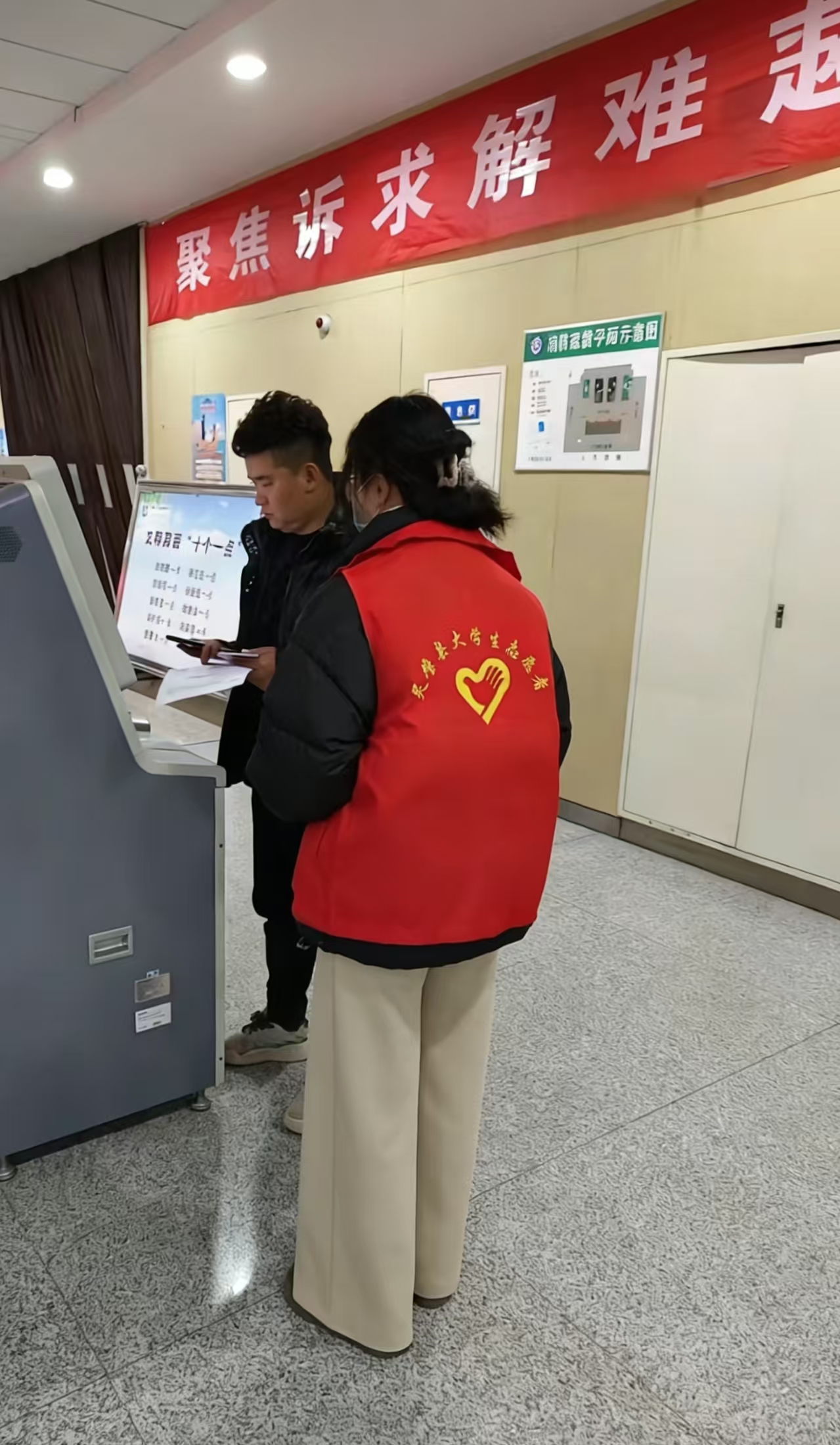 门诊大厅人流密集、咨询集中。身穿志愿马甲的同学们分工协作、坚守岗位:在自助机区,他们手把手协助老年患者挂号、缴费、打印报告,耐心化解“数字鸿沟”;在导诊台与候诊区,他们细致解答路线咨询、引导有序排队,安抚就诊群众的焦虑情绪;面对行动不便、独自就医的特殊人群,主动搀扶、全程陪诊,用贴心举动守护就医安全。一句句温和指引、一次次及时援手,让紧张的诊疗环境多了温情与顺畅。