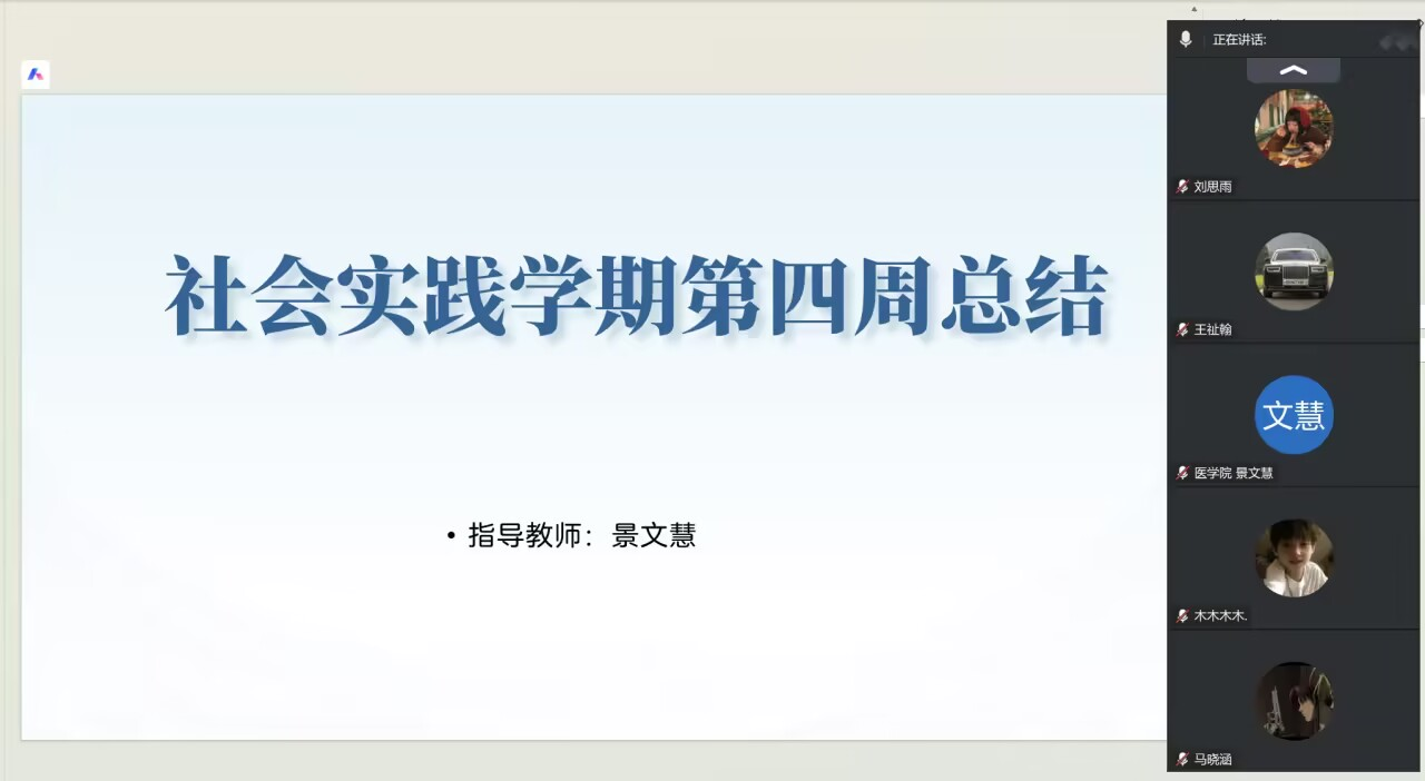 1月30日晚上八点,医学院于线上会议室召开专业实践学期第四周总结会议,会议由孙玉翡老师主持,全体参与专业实践的学生参会。