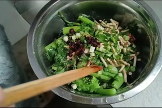 第一道凉拌野菜,是助产学241班伍金莉同学走进自然、感知乡土的生动实践。她在田间地头采摘新鲜的野菜,仔细清洗后切段,搭配葱段、干辣椒等调料,再淋上秘制酱料拌匀。这道菜不仅保留了野菜的清新口感,更让她体会到“取之自然,食之有味”的生活智慧,也让她对食材的本真与乡土的馈赠有了更深的敬畏。