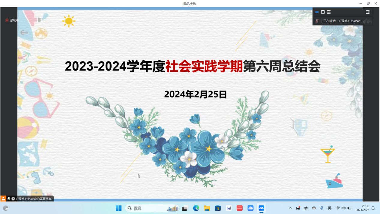 2024年2月25日健康与护理系苏森森老师通过腾讯会议对所带5组生涯学生召开了社会实践学期第六周的总结会。