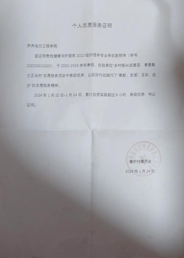 随着人口老龄化的不断加剧,60岁以上的老年人变得越来越多。关注这些老年人的健康已经成为刻不容缓的问题,本次社会实践学期我选择参与的志愿活动便是此类。我觉得志愿服务是奉献社会,服务他人的一种方式,而关爱老人则是传递爱心,播种礼貌的一个过程。在关爱老人志愿服务过程中,我得到了提高、完善和发展,精神和心灵得到了满足。志愿服务既是助人也是“自助”,既“乐人”,也“乐己”。