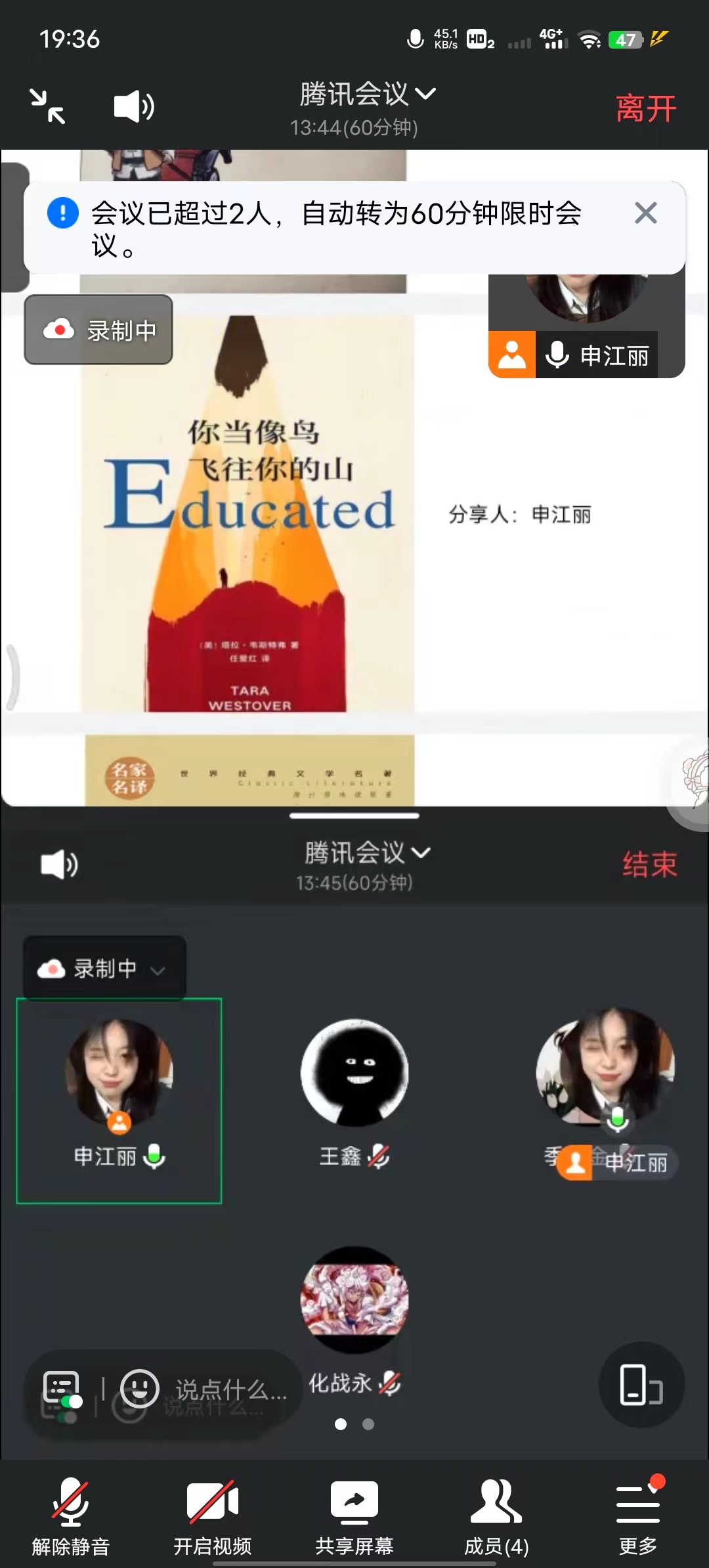 在读书分享交流会上四位同学分别分享了各自阅读的书籍。其中季相金同学分享的是《一只特立独行的猪》、王鑫分享的是《骆驼祥子》、申江丽同学分享的是《你当像鸟飞往你的山》、化战永分享的是《老人与海》。大家分享了不一样的书籍,在此次读书分享交流会中都收获到了不同的财富。
