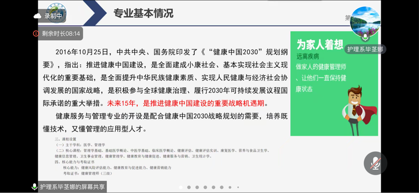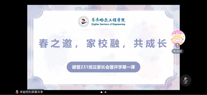 会议伊始,主持人李超然为我们介绍了此次“云家长会”的目的,并且带同学们和家长们回顾了大一第一学期,同学们一起度过的美好时光。随后,由学生代表刘亿进行发言,她为同学们带来了积极的思想,以她为榜样,努力学习,在接下来的学期中奋斗不息。接着,专业长毕茎娜老师为家长们介绍了此专业的相关内容,以及为同学和家长们对“如何获取毕业证”的疑问进行了解答。最后,辅导员岳国鑫老师,对这次会议进行了总结,希望同学们能够在上学期中汲取经验教训,改掉不足,在下学期中好好学习。
