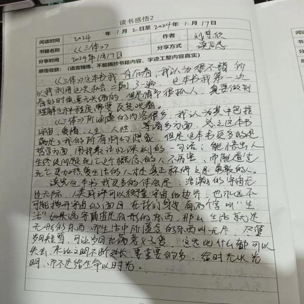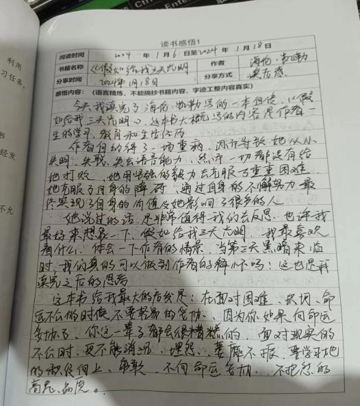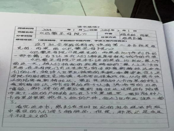 其中健管221班刘美鑫同学阅读了《巴黎圣母院》,看完了这本书让她感受到在当时世纪的社会统治阶级中善良的人们成了牺牲品,但是,邪恶还是永远斗不过正义的。然后健管221班杨宇龙阅读的是《假如给我三天光明》,阅读完这本书带来的启示是,在面对困难,坎坷时不要轻易的放弃而应该积极向上的面对生活。其次是健管221班朱之玉阅读的《三体》,通过这本书让他明白了浩瀚的宇宙无边无际,人类或许可以衡量宇宙的边界,也永远不可能揭开宇宙的面目。最后是健管221班刘滢丹同学阅读的《你的努力终将成就最好的自己》,这本书告诉她,无论这个世界好与不好,现实是残酷的还是美好的,你都要努力,是改变未来的决定性力量。