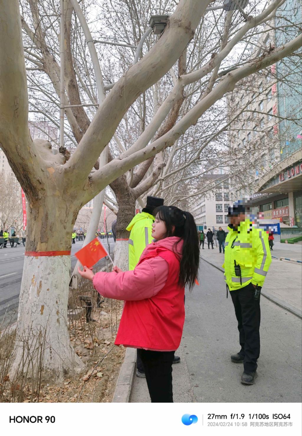 王婷在家乡的元宵街道路演当志愿者,同警员一起维护街道秩序,保证现场活动的正常进行以及人民的安全。