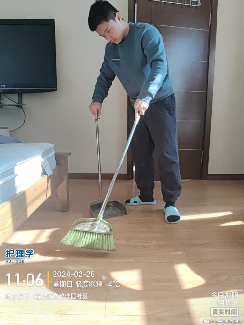 活动伊始,周泽林向老人们祝贺新年快乐,并询问近来生活状况,谈及老人当年事迹时,老人们滔滔不绝,脸上洋溢着笑容;当问到老人家里状况时,大部分老人都说到,自家孩子常年在外地打工,就过年能回来看看自己,不过知道他们忙,能回来看看自己就知足了。活动中途,周泽林展示了一些适合老年人的简单基础的健身动作,并纠正动作中出现的一些小问题,希望老人们能够有个健康的身体。下午,周泽林跟随社区工作人员一起打扫了老人们的房间,内容包括扫地、拖地、更换床单、被褥,目的是为了给老人创造一个干净、舒适的环境,让老年人不会感到反感。