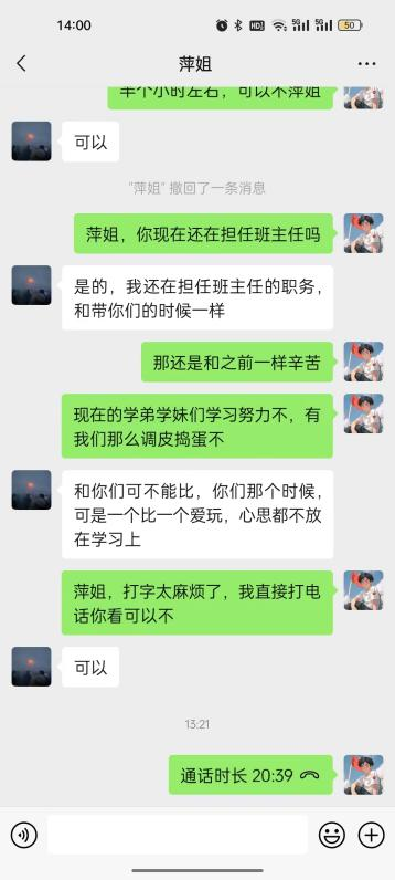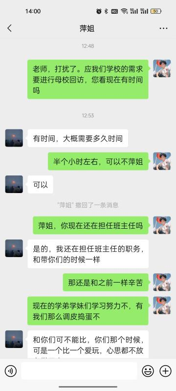 我和老师聊起了大学学习生活的点点滴滴,与老师沟通了所学习的专业与将来想要就业的小目标,介绍了自己生活的大学校园。也和老师聊起学弟学妹们的学习生活,向他们讲起了自己高中时的学习方法,为他们答疑解惑,又告诉学弟学妹们一定要珍惜高中剩余的时光,为自己设想的将来做好从能力素质到心理状态的各方面准备。