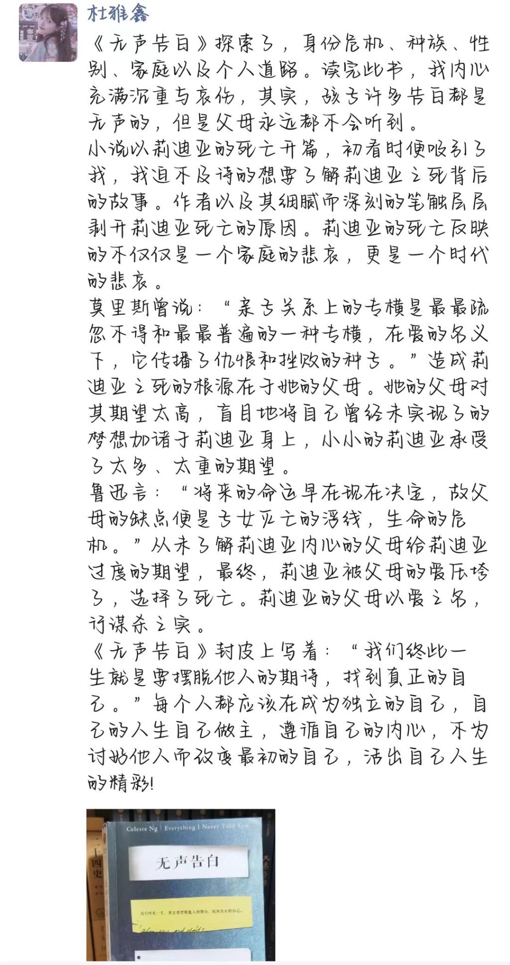 杜雅鑫同学看到《无声告自》封皮上写着:“我们终此一生就是要摆脱他人的期诗,找到真正的自己。”每个人都应该在成为独立的自己,自己的人生自己做主,遵循自己的内心,不为讨船他人而改变最初的自己,活出自己人生的精彩!
