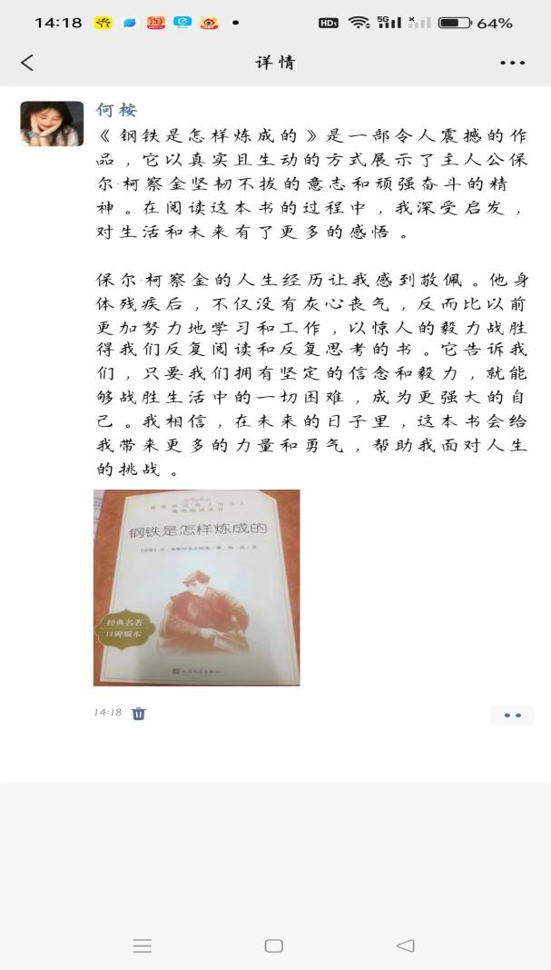 孙艺函同学在假期阅读了《钢铁是怎样炼成的》,她说:人最名贵的是生命。每个人的生命只有一次。人的一生理应这样度过:当他回忆往事的时候,他不会因虚度年华而懊丧,不因碌碌无为而可耻。临终之际,他能够这样说:我的生命和全部精力,都献给了世界上最宏伟的事业-----为人类的解放而斗争。这句话令我久久不能宁静。