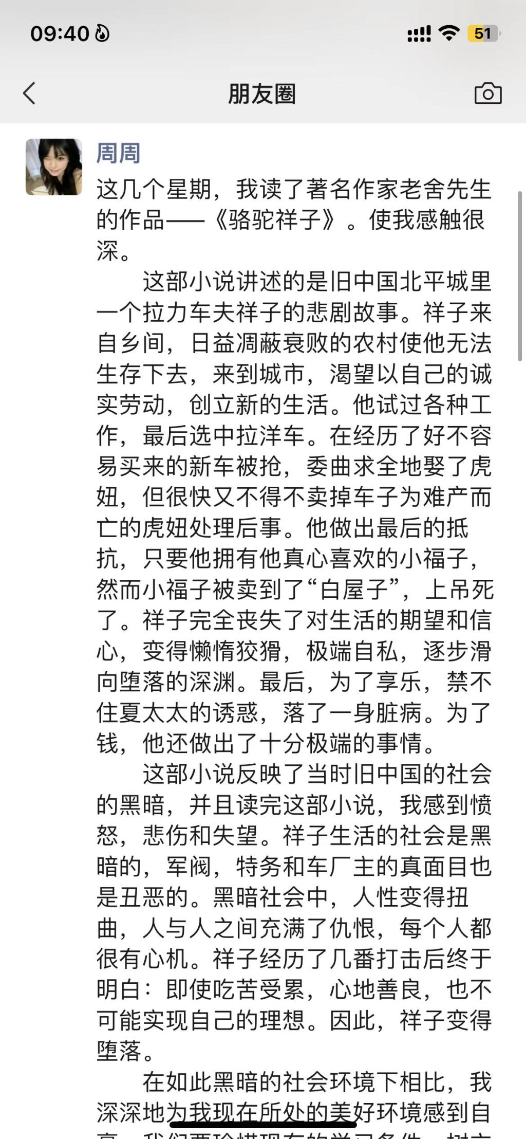 周鑫同学选择阅读《骆驼祥子》,她说:祥子的时代已经过去,随着国家的强大,我们的生活也在发生着天翻地覆的变化,变化之快令人难以想象。我们只能幸福地说:生活真美好!