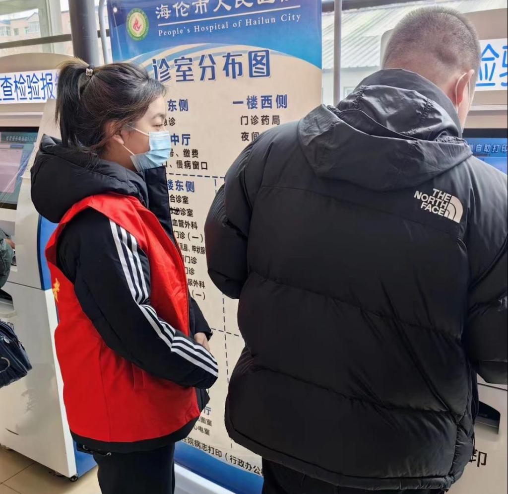 邹梓煜在海伦市医院门诊大厅维持秩序,并且帮助病人及家属挂号。使患者们更好地了解医院,帮助患者节省时间。