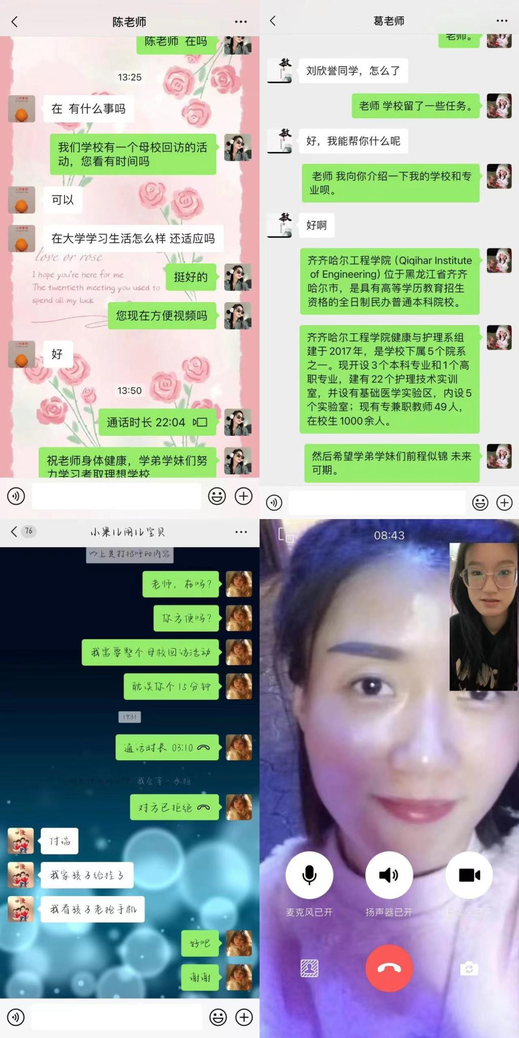 由于春节假期,我们通过线上的方式与母校老师进行联络,感谢老师们的辛勤付出让我们取得了理想的成绩,走上了更为广阔的发展平台。佟林洳和胡家莹同学分别与老师视频通话,与老师共同回忆在校的难忘生活,谈及母校的变化,并分享了自己上大学之后的所见所闻,感谢老师的照顾与帮助,同时表达了对老师的想念;刘欣誉和付瑞同学通过微信聊天的方式在字里行间表现出了对老师的感恩,介绍了大学的基本情况和所学专业的特色,还分享了在大学生活中学到的许多知识和经验,并根据专业所学与老师分享了如何吃的更健康。