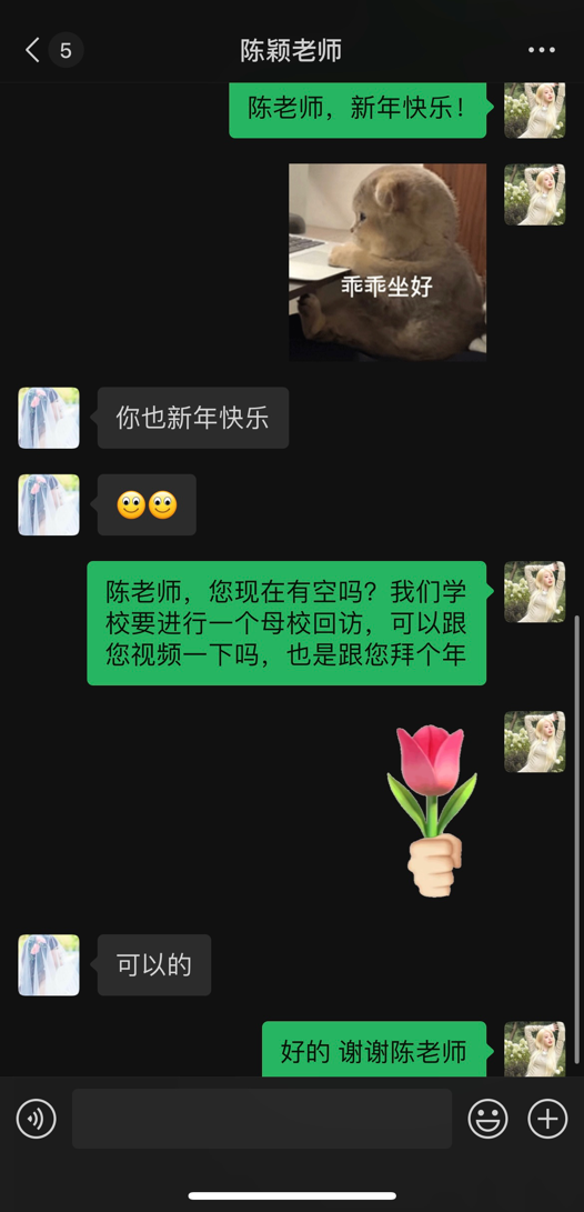 为了丰富大学生假期生活,提高大学生综合素质,于2024年2月14日在微信与高中老师进行了“母校回访”活动,出席本次活动的有陈颖老师,参与本活动的有蒋瑜涵同学。