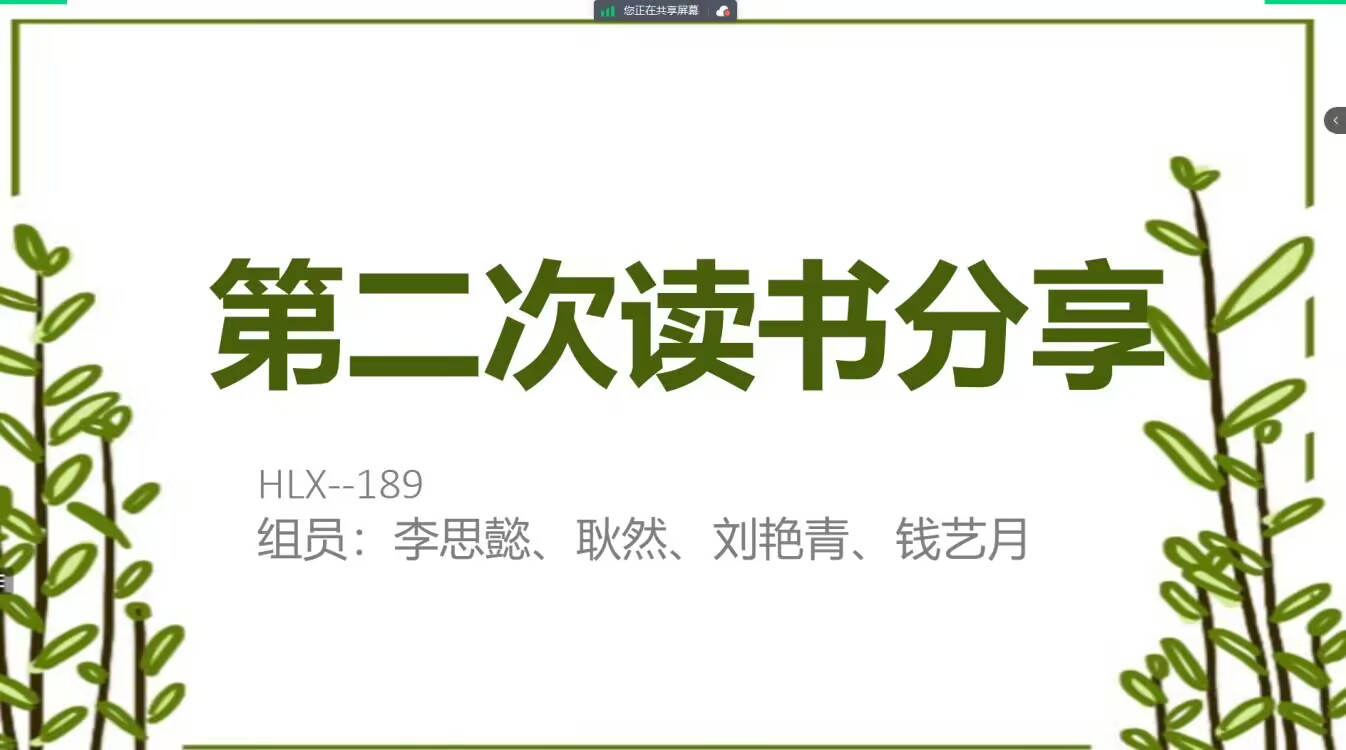 为培养良好的阅读习惯,开阔视野,营造浓厚的读书氛围。2024年2月7日,健康与护理系HLX-189小组在腾讯会议开展了线上读书分享会。本次会议由李思懿主持,耿然、钱艺月、刘艳青参加。