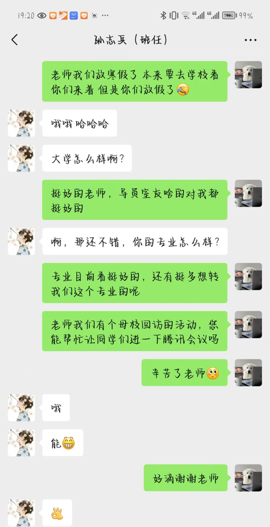 在2024年1月28日肇源一中进行了母校回访活动。时光荏苒,岁月如梭,不知不觉我已经上大学半年了,寒假进行了社会实践学期的母校回访活动。由于高中学生放假,老师不在本地,我选择与高中班任线上联系,并拜托老师让学弟学妹们配合我完成这项任务,所以我们以腾讯会议的方式进行母校回访。老师询问了我的大学生活过得怎样,我对老师讲述了我在学校的生活情况,老师们都很认真负责,导员对我们也很好,与同学室友的关系都非常融洽。老师还关心了我的学业,提醒我认真学好专业知识,努力提升自己的专业水平。我对老师也表达了关心和感恩之情。同时还为学弟学妹们讲述了我的大学生活以及我们学校,学弟学妹们也很感兴趣。