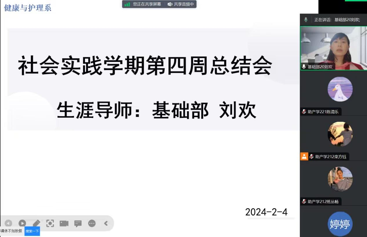 2024年2月4日19:00生涯老师刘欢在腾讯会议召开了社会实践学期第四周总结会议,HLX221组-HLX228组全员参加。
