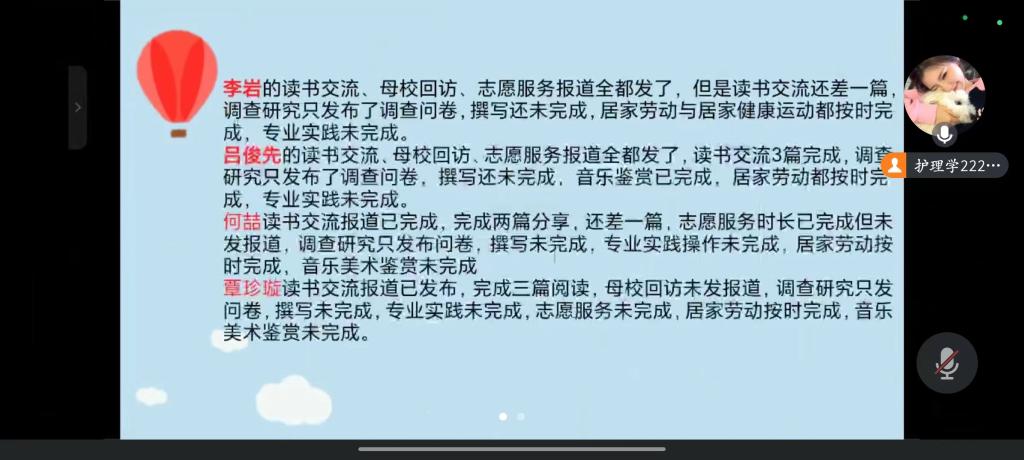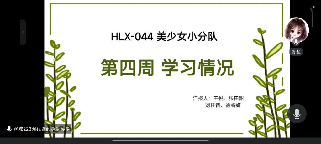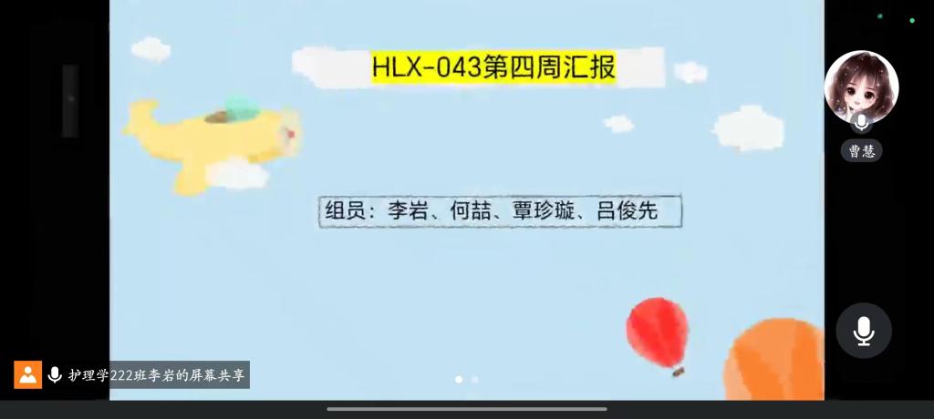 2024年2月3日晚20:00,社会实践学期HLX-043、044组组织召开的第四周总结会。本次会议由护理学222班李岩主持,生涯导师曹慧及HLX-043、044成员参会。