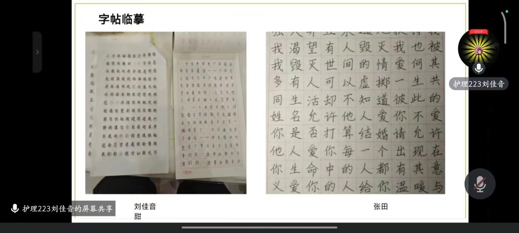 首先,由HLX-043组李岩和HLX-044组刘佳音汇报本周小组成员任务完成情况,两组成员均按时完成字帖和临摹。