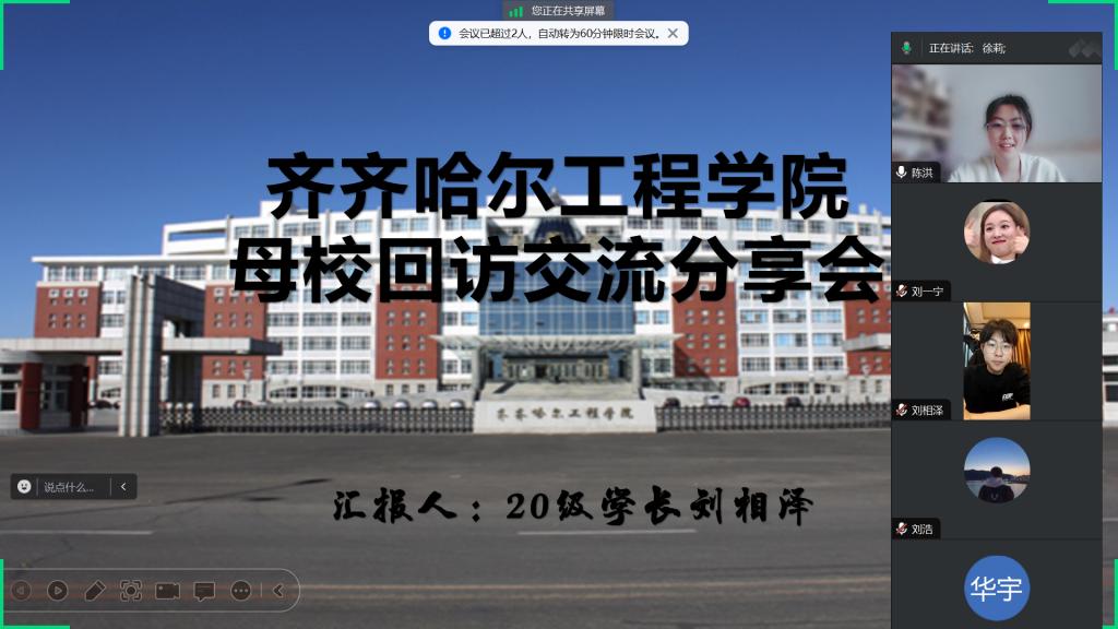 刘相泽同学通过腾讯会议的方式,与老师和母校学弟学妹们互相问候,分享各自的生活和工作状态。大家回忆起在校园里的点点滴滴。