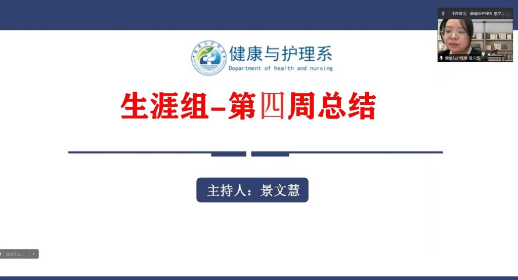 大学是人生正确价值观养成的关键时期,2024年1月29日-2月04日是社会实践学期的第四周。景文慧生涯小组于腾讯会议开展第四周总结会。本次会议由生涯指导老师景文慧主持,生涯小组全体同学参加。在生涯指导老师景文慧的指导下,第四周的任务圆满结束。