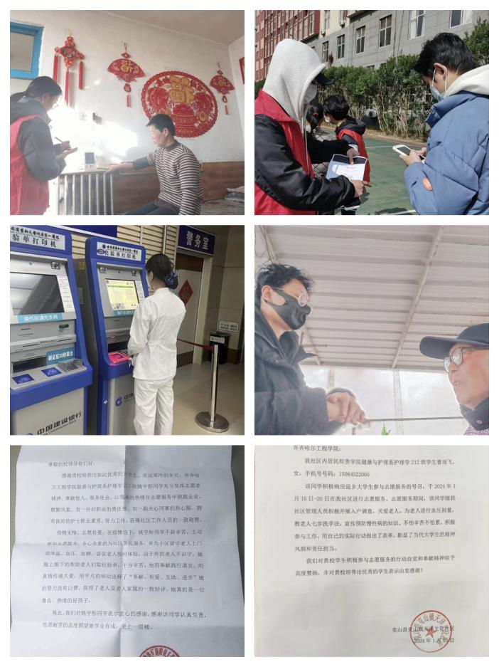 在这次志愿服务中,护理学212王学志给社区老人科普健康知识,如何去预防高血压、糖尿病等老年常见慢性疾病,并教老人们如何进行正确的七步洗手法;护理学2121姚宇彤帮助社区老人测量血压体温等,并帮助腿脚不便的老人去医院拿取健康体检单等,获得表扬信;护理学212王帅跟随志愿团队,在社区中收集居民信息、填写健康表格等,完善居民信息;护理学212曹雨飞为社区中的老人测量体温、血压等,并及时记录老人的血压体温的情况,为老人科普慢性疾病的预防措施,获得表扬信。